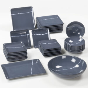 Asta scadutaCeramica color grigio, servizio comprendente 8 piatti rettangolari grandi, 8 medi, 8 piccoli (uno con lievi sbeccatura), 8 piatti rotondi medi, 1 piatto da portata rettangolare, 1 zuppiera tondaProvenienza: Collezione privata