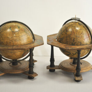 Asta scadutaH. ca. 30 cm ciascuno, base in legno, anelli meridiani di ottone, in parte fissaggi mancanti, diverse piccole mancanze dai globi, grandi mancanze dagli anelli dellsorizzonte