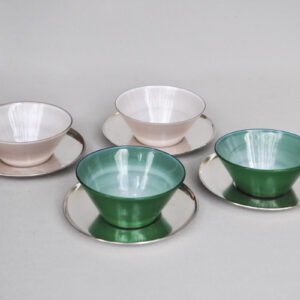 In vetro incamiciato, cadauna h. 9 cm, diam. 13,5assieme piattini in argento produzione Finzi, diam 18 cmProvenienza: Collezione privata