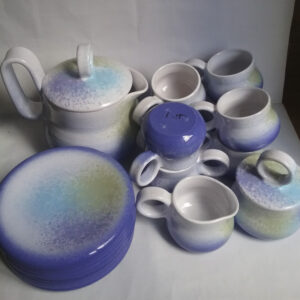 Asta scadutatazze e piatti con teiera, zuccheriera e lattiera in ceramicasmaltata policroma. Teiera h. 18 x 14 cm' piatti diam 16,5cm' zucch. h. 12 cm. In ottime condizioniFirma alla baseProvenienza: Collezione privata