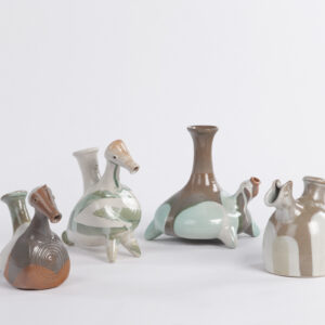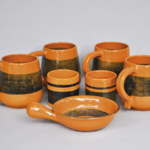 Asta scadutabicchieri,grandi e piccoli (h. 9/11 cm), piatti da antipasto, piani e fondi (diam. 20/21/26 cm), terrine (diam. 14 cm), 2 caraffe (h. 18 cm), 2 ciotole grandi (diam 21,5 cm) , in ceramica color arancione.In ottime condizioniFirma alla baseProvenienza: Collezione privata