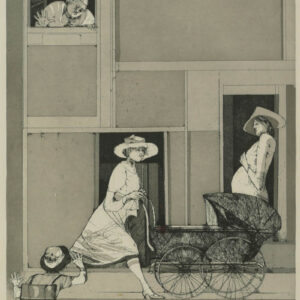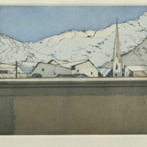 Acquaforte su carta, 15,5 x 33 cm (Lastra), in cornice. Firma, data e numerazione (165/200), macchie di umidità sul bordo.