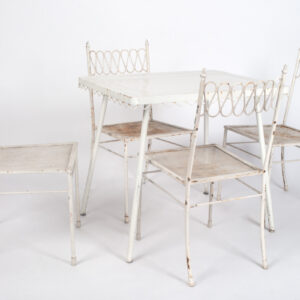 Asta scadutaFerro laccato color bianco, tavolo H. 80 x 60 cm,segni del tempo, da riverniciareProvenienza: Asta Hotel Bristol 2010, collezione privataDel nuovo edificio realizzato negli anni "50 da Arnaldo Bennati su progetto dell"Architetto veneziano Marino Meo, che si avvalse della collaborazione per la realizzazione dell"illuminazione della Seguso vetri d"arte di Murano, vengono presentati una serie di…