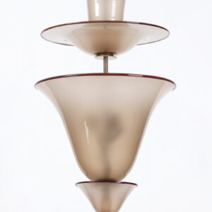 Asta scadutaA copri luce "a mazzo di tulipani", in vetro color amaranto e finale in vetro dorato, h . ca 31 cm, larghezza 16 cm, impianto elettrico da rifareProvenienza: Asta Hotel Bristol 2010, collezione privataDel nuovo edificio realizzato negli anni "50 da Arnaldo Bennati su progetto dell"Architetto veneziano Marino Meo, che si avvalse della collaborazione per…