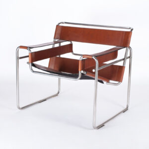 Asta scadutaAcciaio cromato, pelle. Sospensioni in cinghie di cuoio (restaurate). H. 76 cm x 71 x 45 cm. La seduta e lo schienale sono interamenteformati da quadri di rivestimento di egual misura cuciti tra loro con bordiniimbottiti e bottoni (alcuni mancanti) tra le intersezioni.Assieme: pouff in pelle rossa, H. 48 cm,lunghezza 130, larghezza 70 cmProvenienza: Collezione…