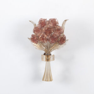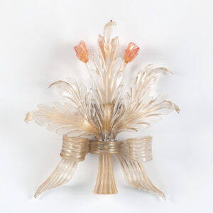 Asta scadutaCosidetta a "nido d’amore", finale in vetro color oro con fiocchi, composta da 2 fiori vetro color amaranto adornati da 5 foglie color oro, H. 55 cm, larghezza 39 cm, sporgenza 15 cm, impianto elettrico da rifareProvenienza: Asta Hotel Bristol 2010, collezione privataDel nuovo edificio realizzato negli anni "50 da Arnaldo Bennati su progetto dell"Architetto…
