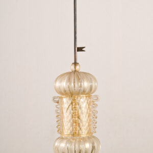 Asta scadutaCosidetto "lampione veneziano", in vetro oro, H. 38 cm, asta di sospensione 37 cm, impianto elettrico da rifareProvenienza: Asta Hotel Bristol 2010, collezione privataDel nuovo edificio realizzato negli anni "50 da Arnaldo Bennati su progetto dell"Architetto veneziano Marino Meo, che si avvalse della collaborazione per la realizzazione dell"illuminazione della Seguso vetri d"arte di Murano, vengono…