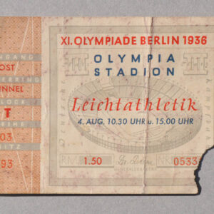 Asta scadutaGiornata del 4 agosto dalle ore 10.30 alle ore 15.00,stampa a col., 10 x 6,8 cm, nell’angolo in basso adestra strappo di convalida per l’ingressoProvenienza: Collezione privataIl biglietto conservato si riferisce all’ingresso allo stadio olimpico per le gare di atletica del 4 agosto 1936. In quella giornata il grande atleta statunitense di colore Jesse Owens…