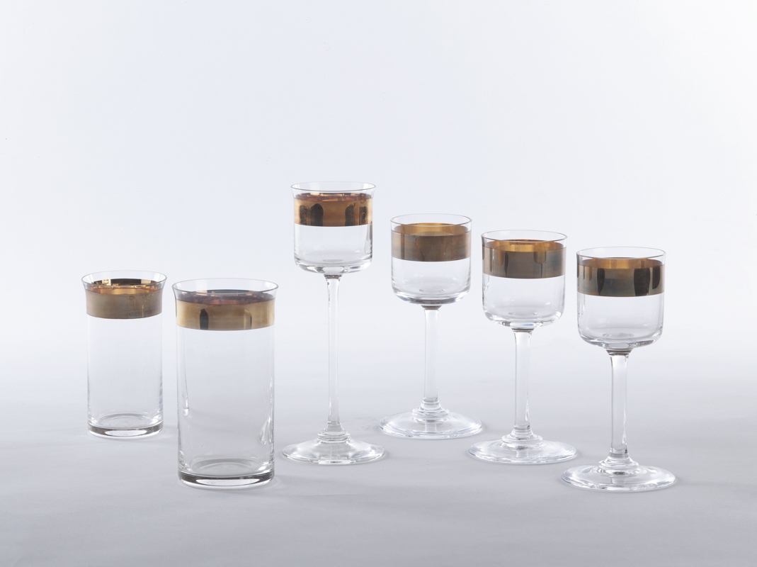 Kristallglas und poliertes Gold, Produktion Manufaktur Kristallglasfabrik Benedict von Poschinger. Bestehend aus: Bierglas H. 11,5 cm‘ Wasserglas H.13 cm.‘ Weiáwein-Glas mit Stiel H. 18 cm‘ 3 Sherry- oder Madeiragläser H. 15 cm