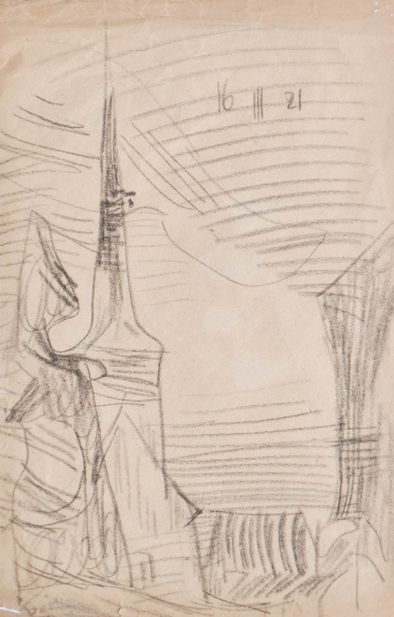 Matita su carta, 26,5 x 18,7 cm, al retro iscrizione manoscritta “disegno autentico di Lyonel Feininger. L.F”, strappetti al bordo inferiore