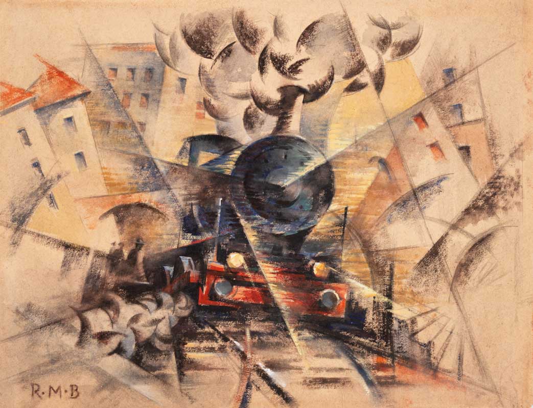 “Rientra negli studi di velocità che, specie nel biennio 1916 – 1917, Baldessari dedica in particolar modo al tema del treno in corsa e del quale ha realizzato un certo numero di opere, sia a pastello che a carboncino, nelle quali si pone di volta in volta l’accento sull’aspetto meccanico, sulla simultaneità oppure su quello sociale (la folla che attende il treno in arrivo alla stazione). In questo caso il treno sta per arrivare in stazione e sta rallentando mentre passa attraverso i quartieri che costeggiano i binari. E’ un unicum tra i disegni ad essere colorato, tanto cheva considerato a tutti gli effetti come un dipinto tout court.”