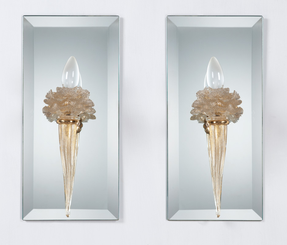Cornucopia e tazza a forma di garofano in vetro/oro, specchio in vetro molato, H. 27 cm, specchio 20 x 43 cm, impianto elettrico da rifare
