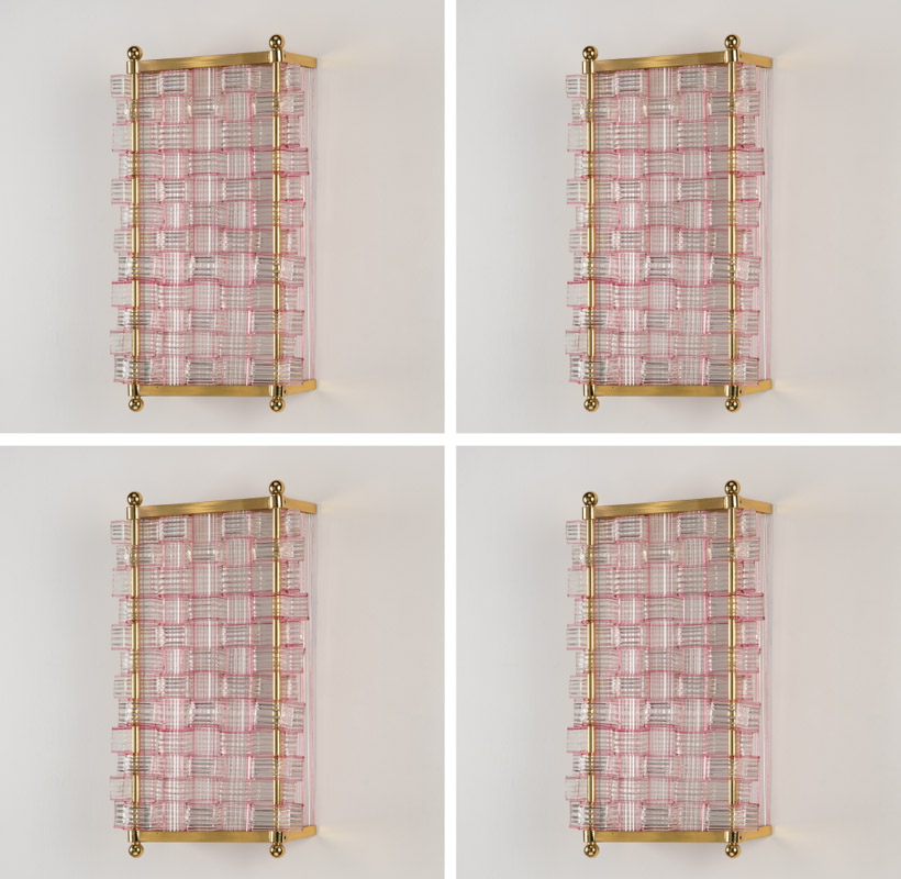 Listelli lineari e ondulati in vetro zigrinato trasparenti color rubino, struttura in ottone, H. 38,5 cm x 11 x 11 cm. Elementi provenienti da un grande lampadario realizzato dalla Seguso Vetri d’arte Murano per l’Hotel Bristol di Merano. Struttura nuova