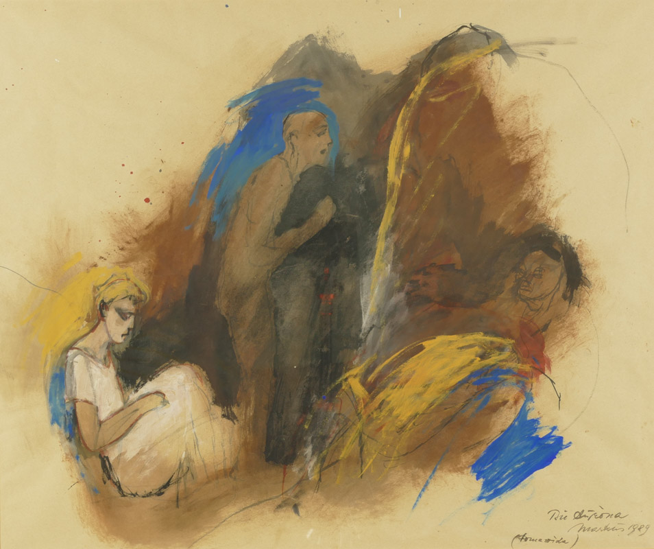 Tecnica mista su carta, 58 x 69 cm, in cornice. Firma, titolo e data