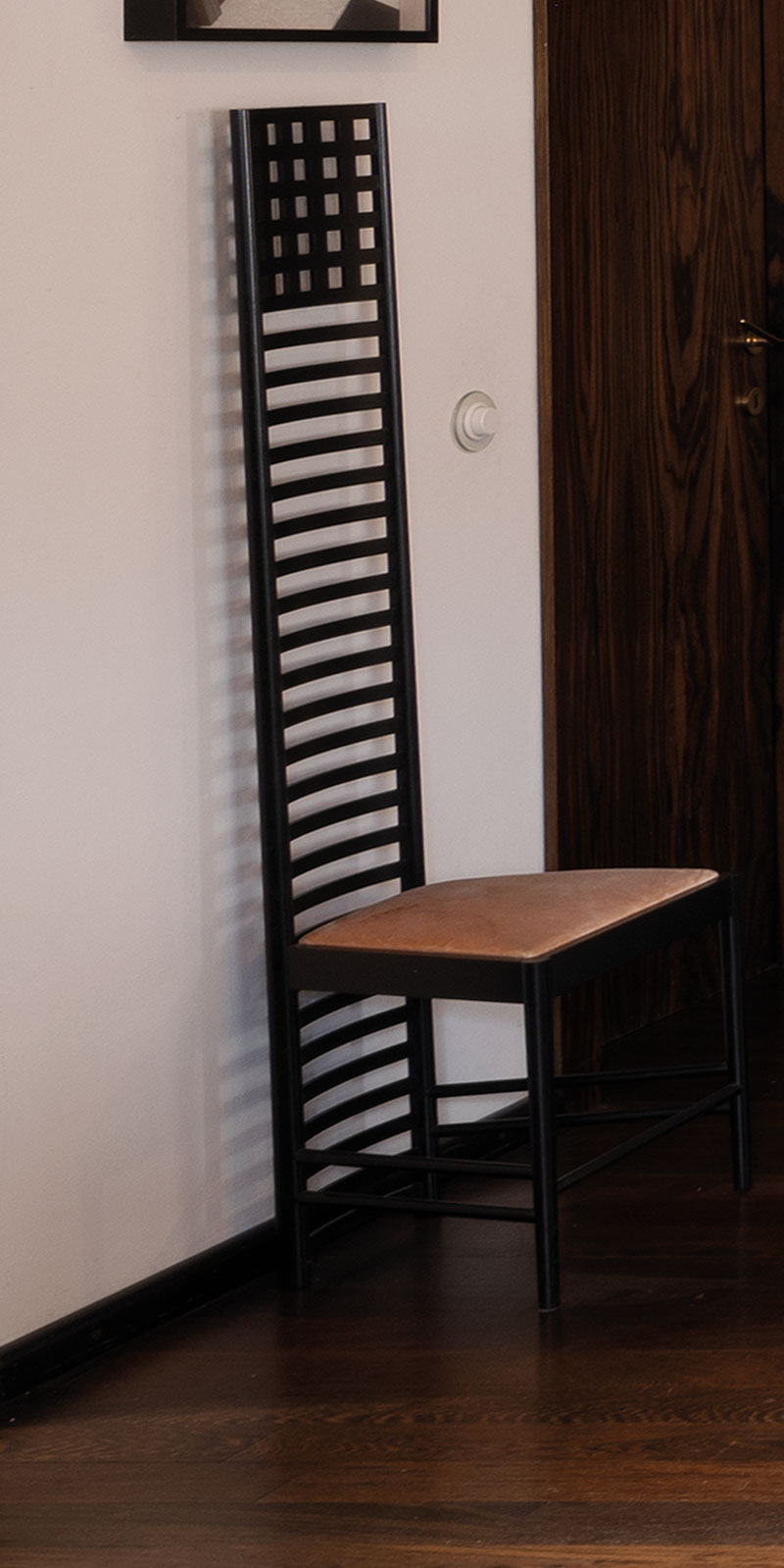 Legno, seduta imbottita, h. 140 x 31 x 36 cm, produzione Cassina su progetto di Charles Rennie Mackintosh, marchio impresso “Cassina”