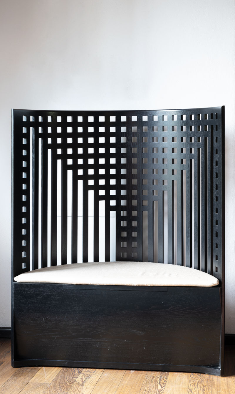 Legno, seduta imbottita, h. 119 x 41 x 94 cm, produzione Cassina su progetto di Charles Rennie Mackintosh, timbro impresso “Cassina 1224”, lievi segni di utilizzo