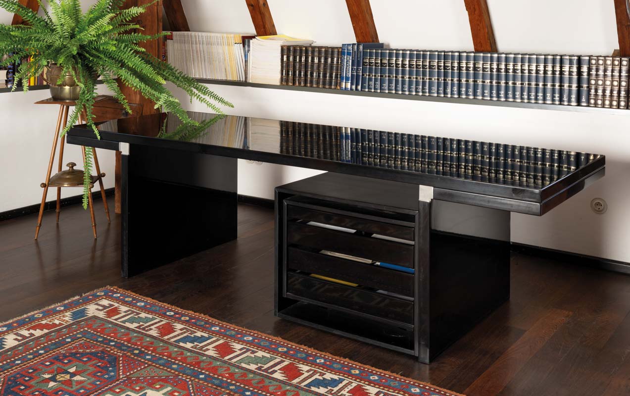 Struttura e piano in tamburato verniciato con base poliestere, nero, h. 70 x 242 x 77 cm, produzione Simon per Gavina. Lievi segni di utilizzo