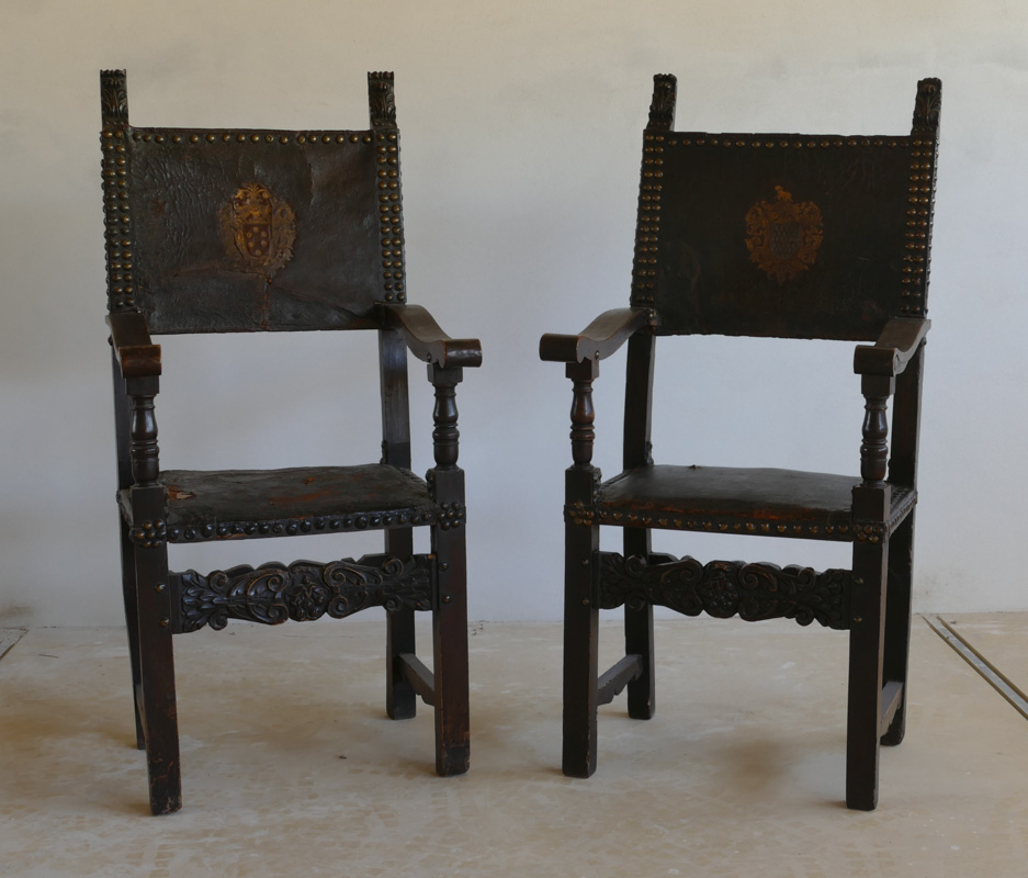 con stemmi impressi in pelle, 133 x 61 x 53 cm. Tracce di usura sulle sedute