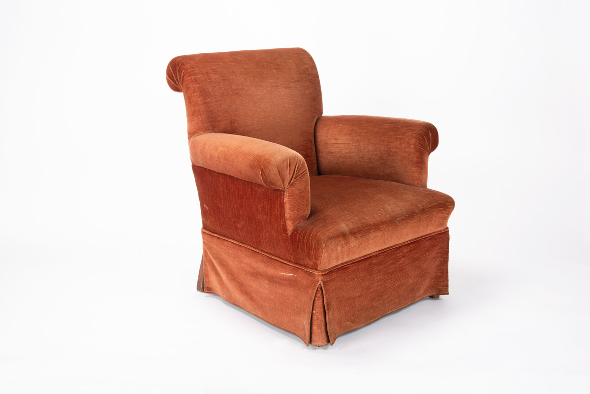 Struttura in legno, rivestimento in tessuto amaranto, h. 83 x 80 x 66cm
