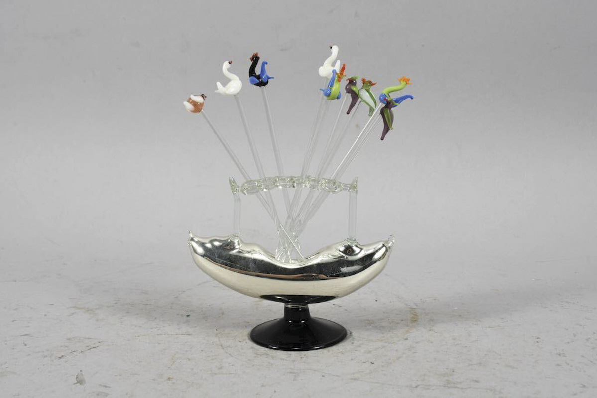 in vetro soffiato su piede a motivo di volatili che poggiano su una carena di nave color argento h. supporto 9 cm x 12 cm. Spiedini