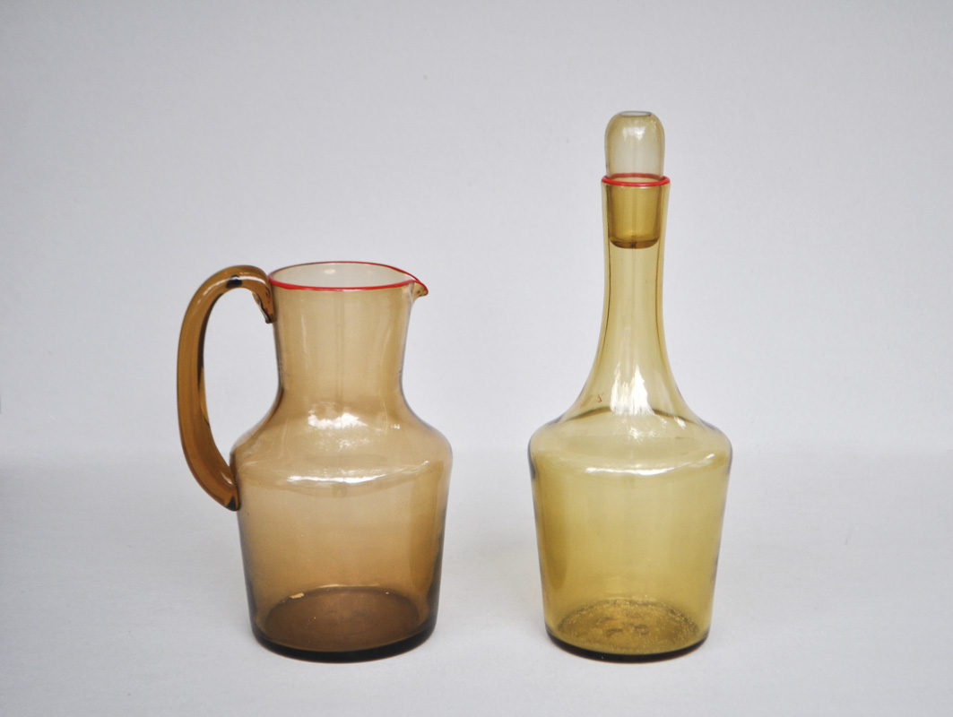 In vetro soffiato paglierino con filo corallo sulla bocca’ bottiglia h. 34 cm, caraffa h. 24 cm