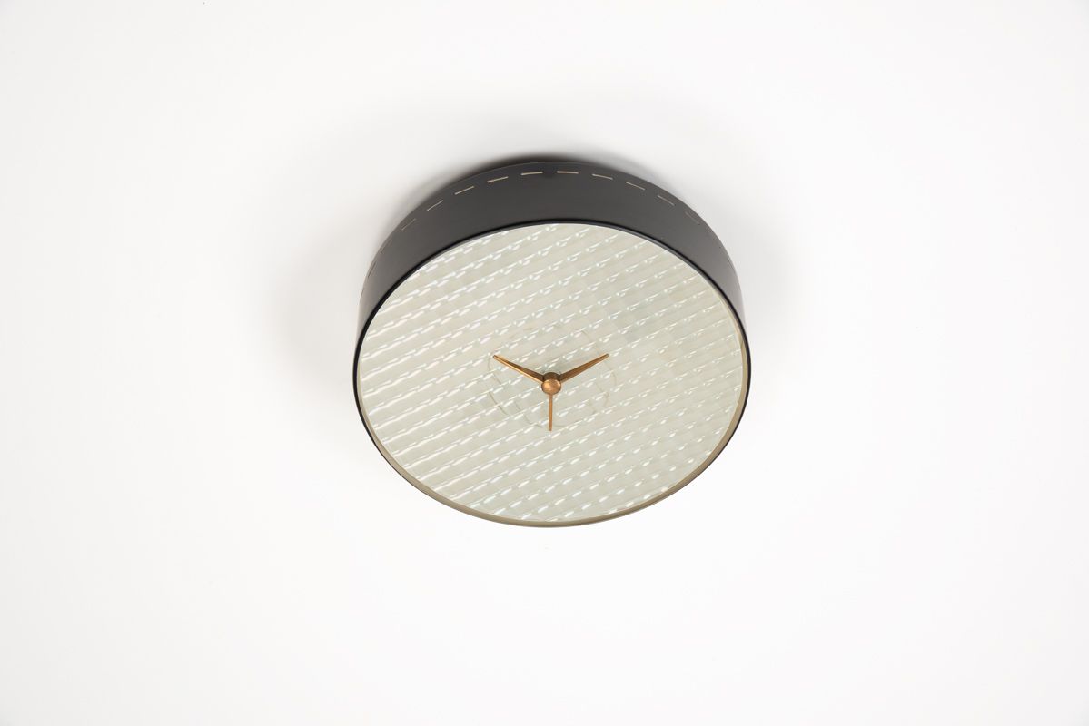 Alluminio laccato, vetro stampato, ottone, Diametro cm 34, larghezza 11 cm, chiusura stella a 3 punte in ottone, vetro lievemente segnato nei pressi della chiusura a forma di stella