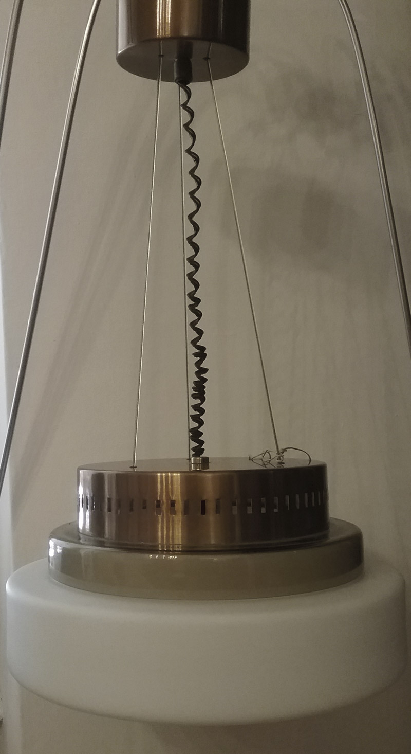 n metallo, vetro opalino satinato, vetro fumé e nylon, h. 80 cm ca., corpo centrale 42 diam. x 28 cm.