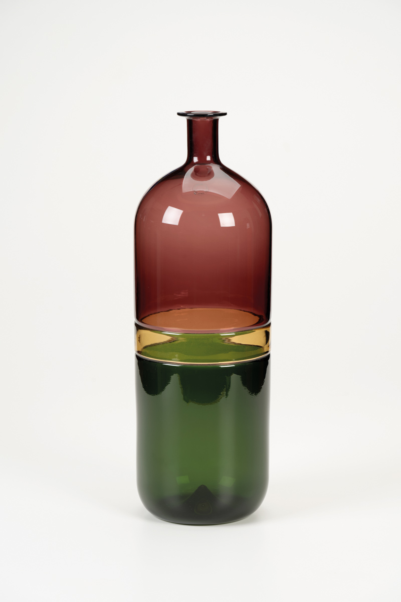 Bottiglia in vetro soffiato leggero e lavorato ad “incamo” a mano, h. 40 cm. Produzione Venini Murano