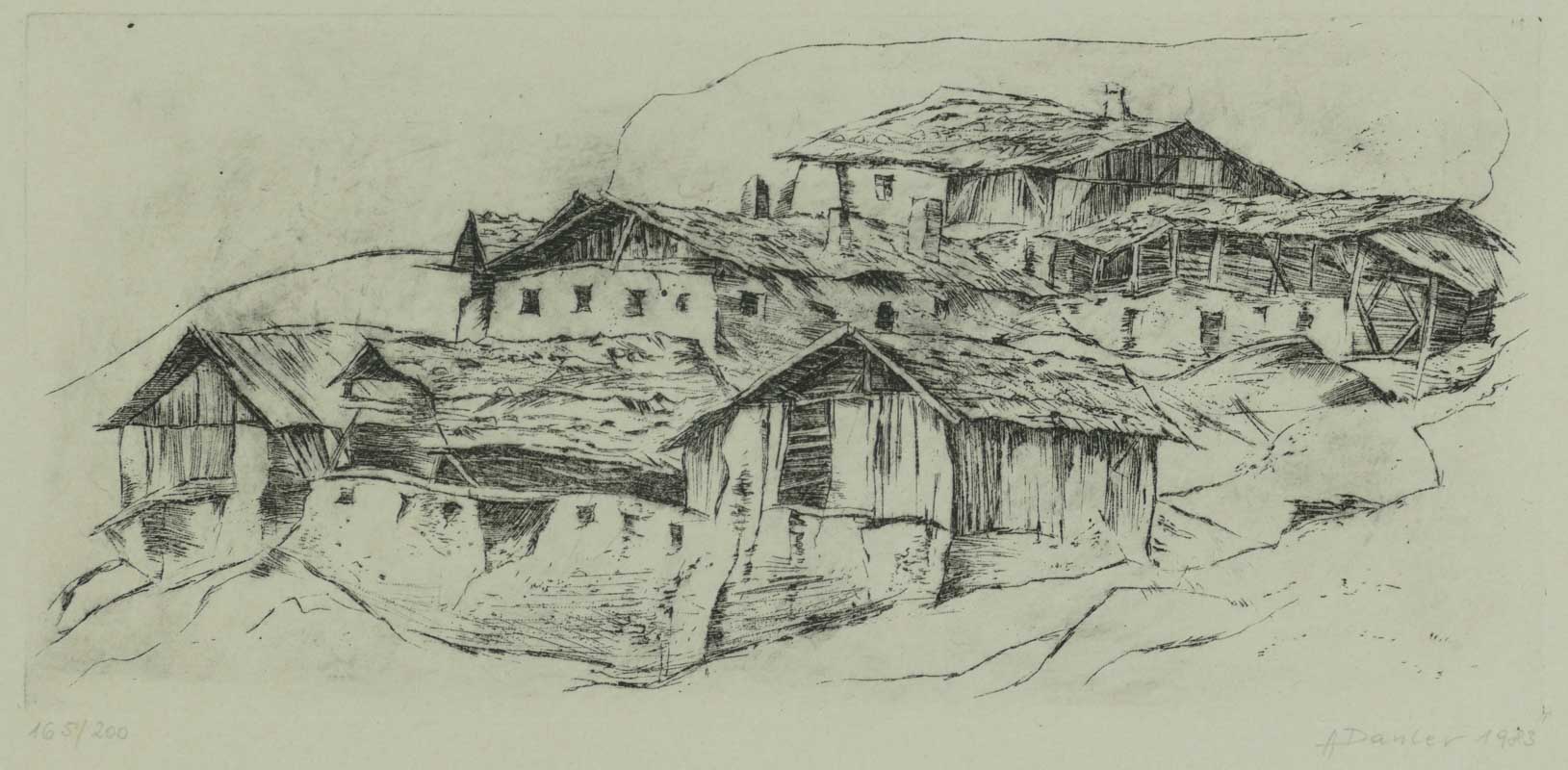 Acquaforte su carta, 15,5 x 33 cm (Lastra), in cornice. Firma, data e numerazione (165/200), macchie di umidità sul bordo.