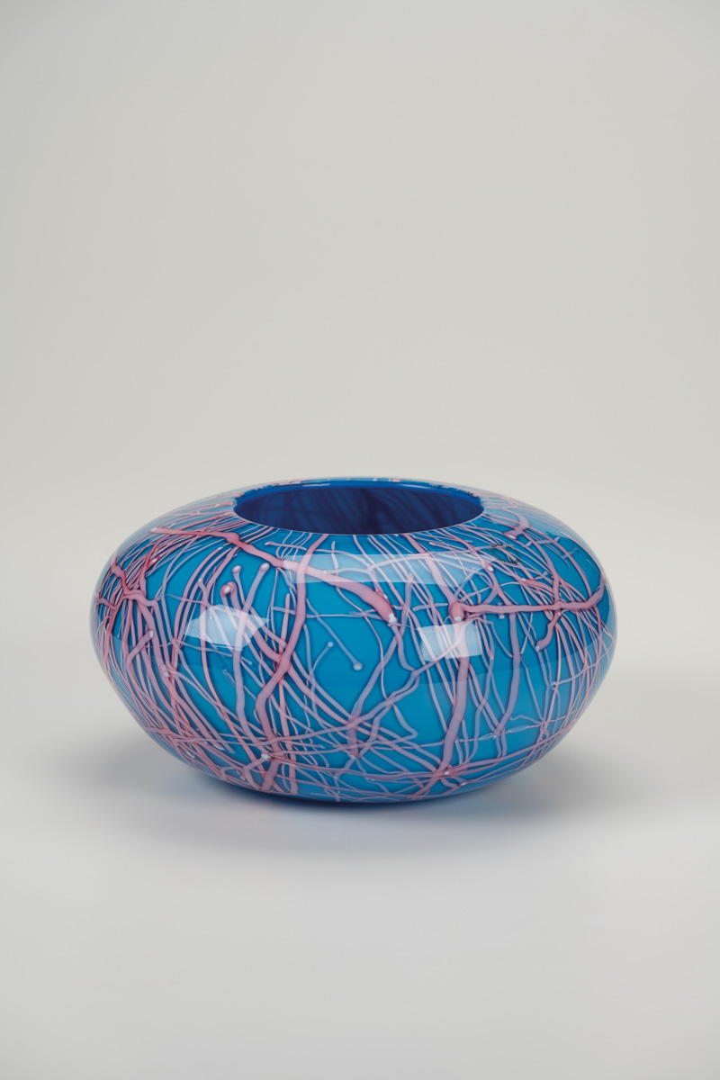 in vetro incamiciato con applicazioni a fili nei toni del rosa. Marchio della manifattura e data incisa sotto la base, produzione Venini Murano