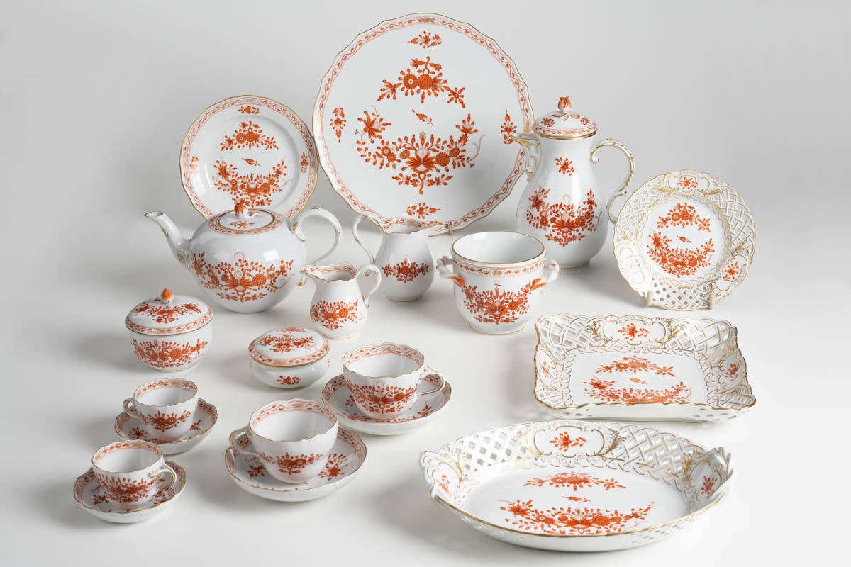 12 tazze da moka, dodici tazze da caffè/tè, 2 diversi contenitori per zucchero/ dolcificante, 12 piatti da torta, 6 piatti traforati da dessert, 2 brocche per latte e panna, 1 teiera, 1 caffettiera, 1 piatto da torta, 2 ciotole traforati da pasticceria