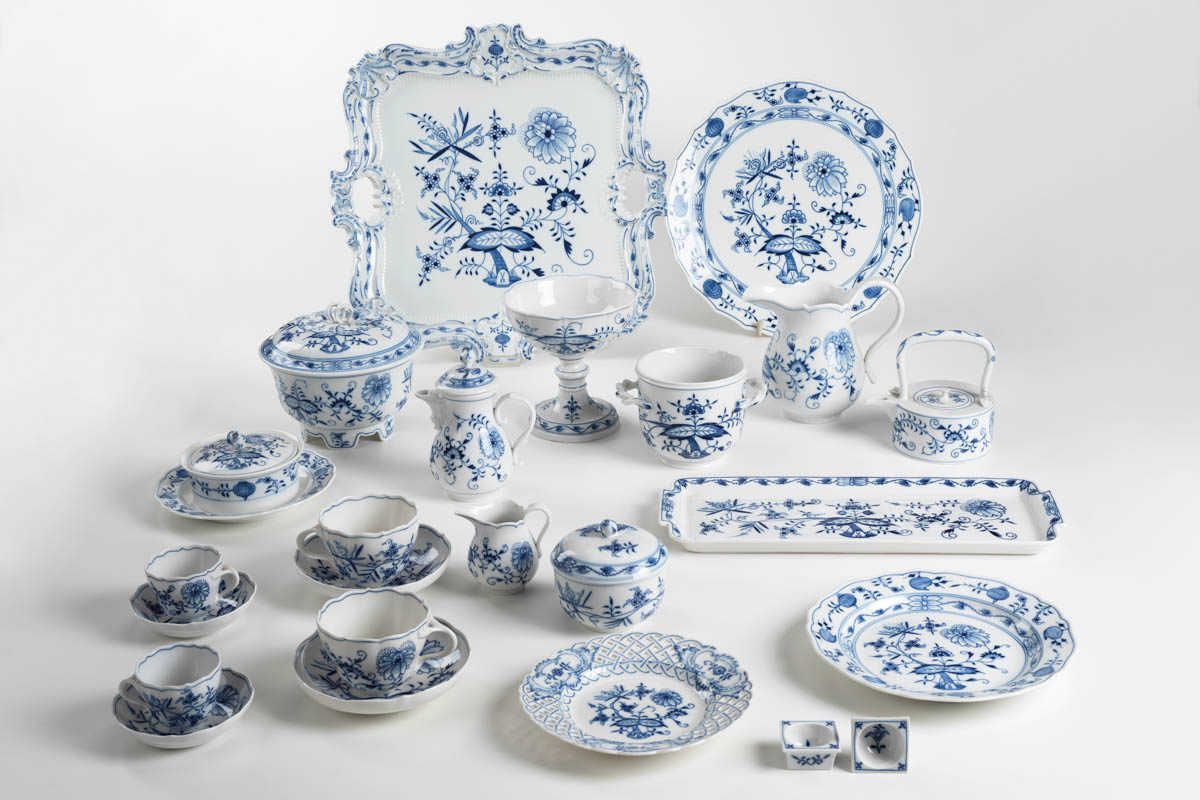 12 tazze da caffè, 12 tazze da moka, 1 teiera, 1 caffettiera, zuccheriera, 2 caraffe per latte e panna, 12 piatti da dessert, 12 piatti traforati da torta, 1 piatto da burro, 1 piatto grande quadrato, 1 piatto da portata rotondo, 1 piccola etagère