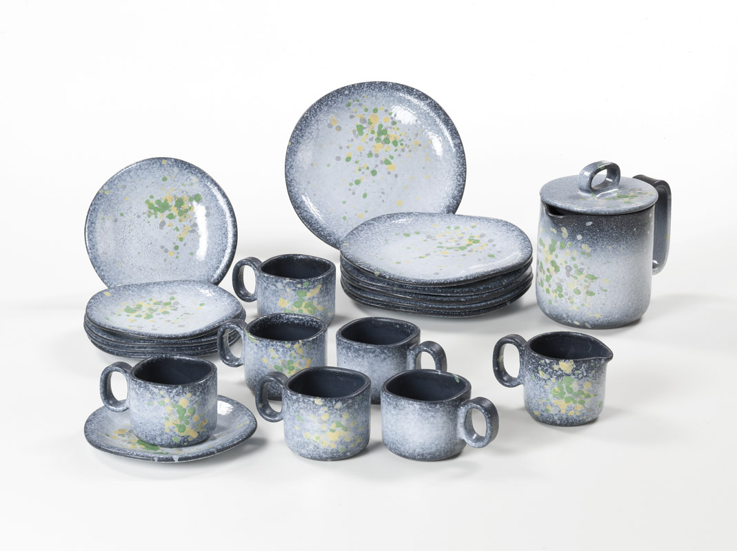 Tazze e piatti con teiera, zuccheriera e latti ra in ceramica smaltata policroma. Teiera h. 18 x 14, piatti diam. 16,5, zucch. h. 12 cm, in ottimo stato firma alla base