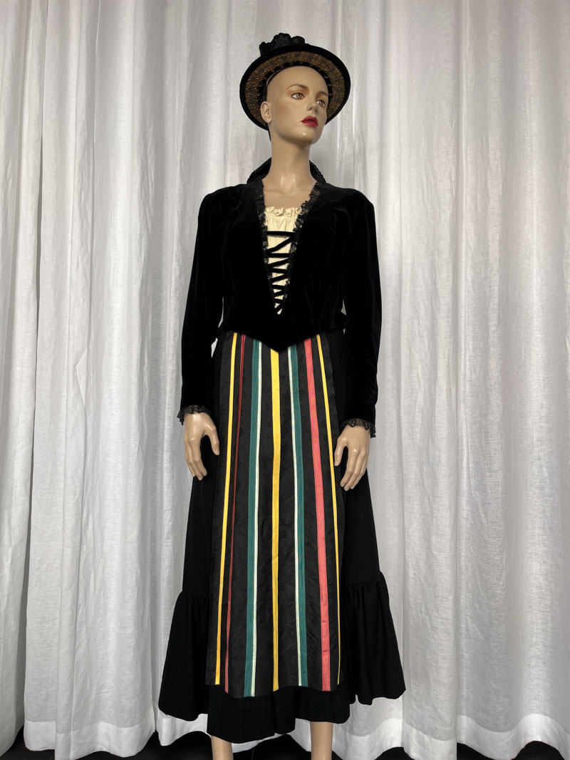 Corpetto In velluto, gonna in panno, striscia con nastri colorati,