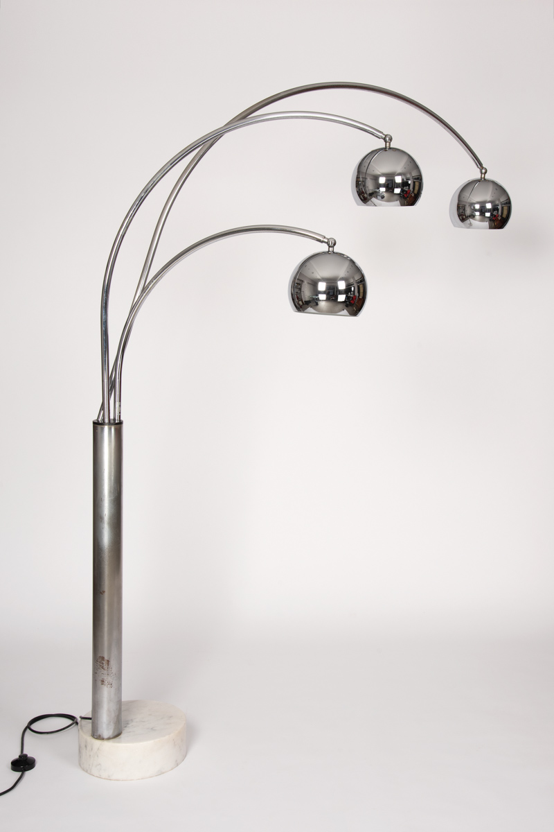 Struttura in metallo cromato con braccia orientabili, base in marmo, h. 190 cm, diam. Base 30 x 10 cm, produzione Reggiani, graffi, perdite di cromatura alla struttura