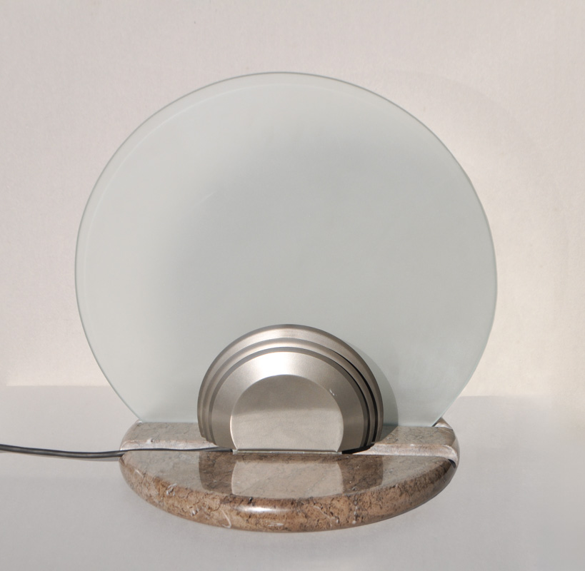 Base in marmo, metallo, vetro opaco, h.42 x 47 cm