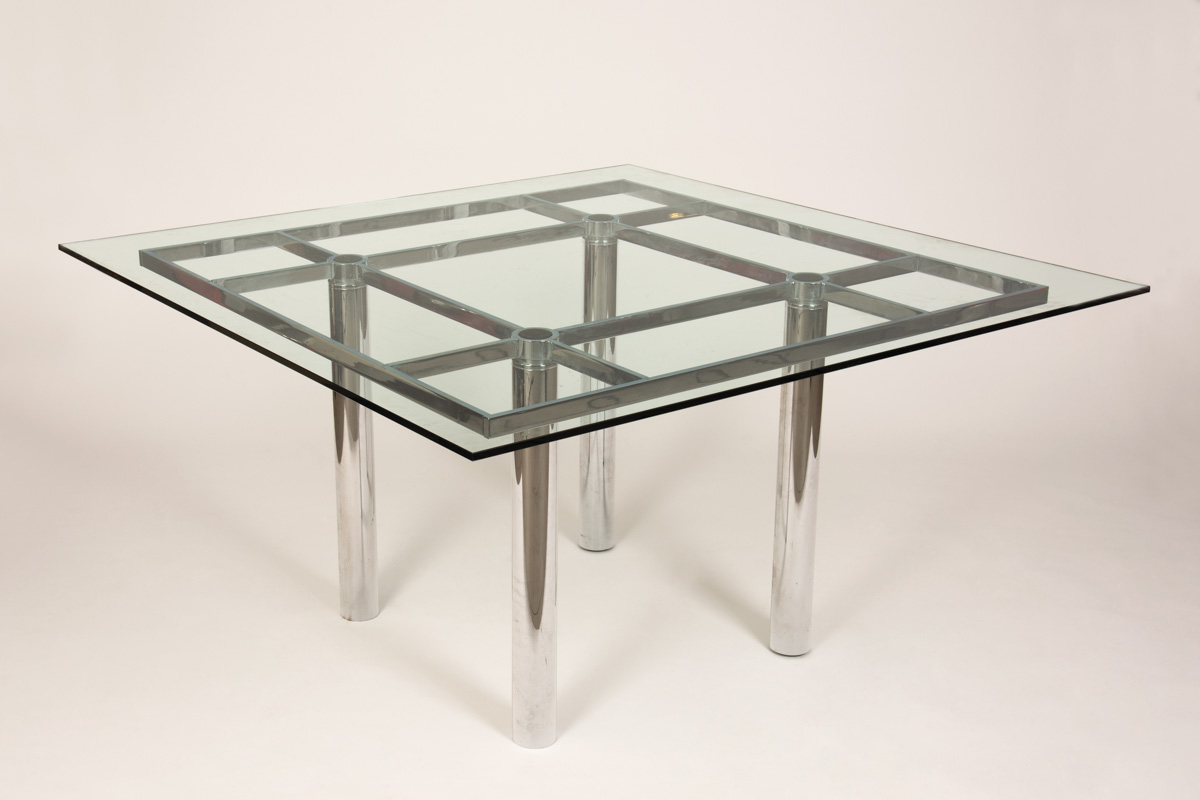 Struttura in metallo cromato, cristallo fumé,h. 72 x 126,5 x 136 cm, produzione Gavina
