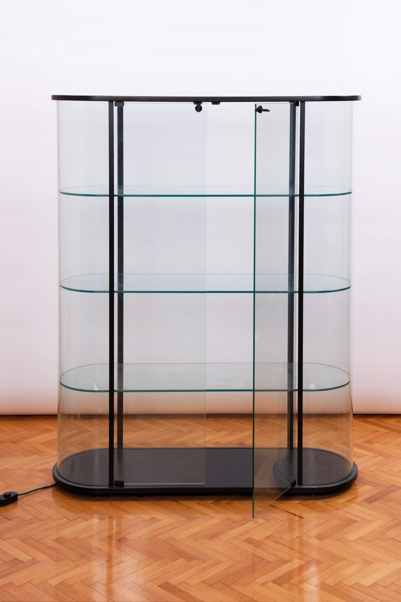 Struttura in metallo, vetro curvo con due ante e tre ripiani,