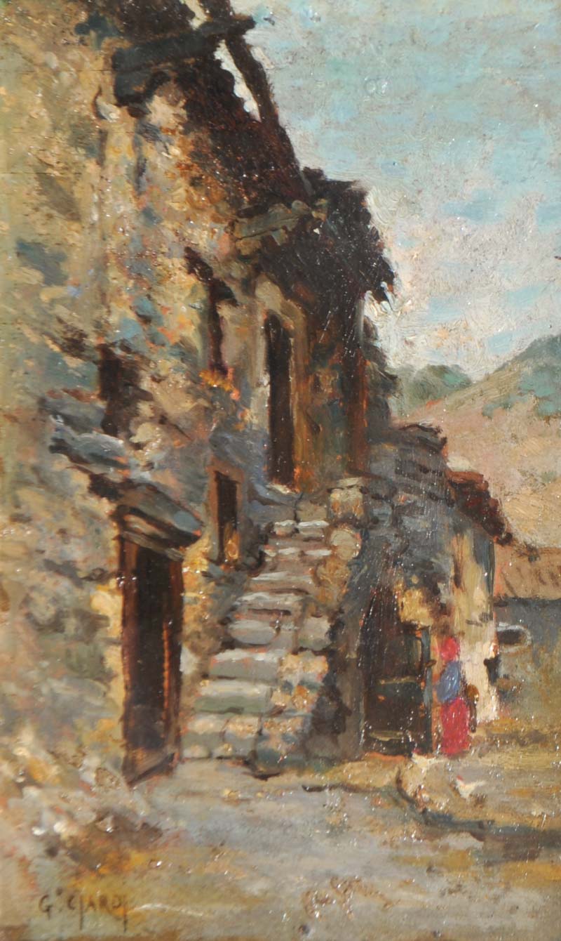 Olio su cartone, 22,5 x 14 cm, al retro timbri Galleria d’arte Cristallo Cortina, Dr. Emilio Sasso Milano e iscrizione manoscritta “questo delizioso dipinto Casolare nel Cadore è autentico di Guglielmo Ciardi. Linda Rita Ciardi. Treviso 25/9/1972”