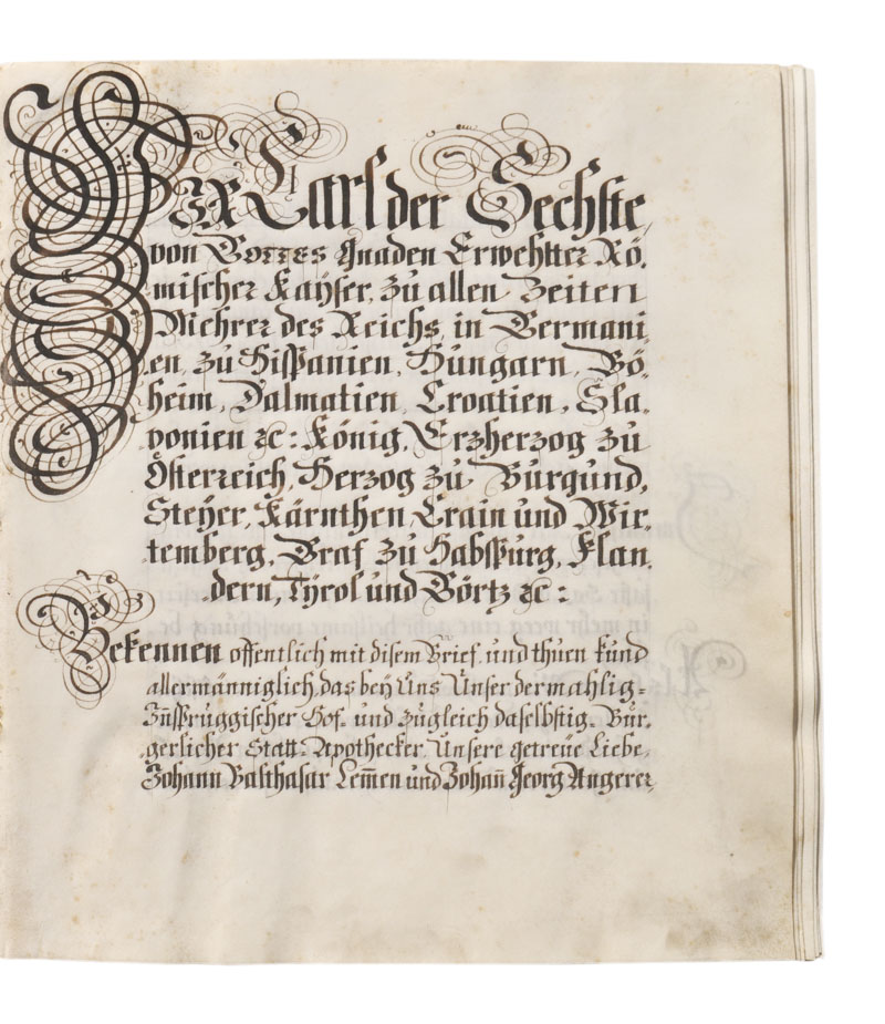 ai farmacisti Johann Balthasar Lemmen e Johann Georg Angerer di Innsbruck, 1727. Manoscritto rilegato, 34 pagine con pergamena,