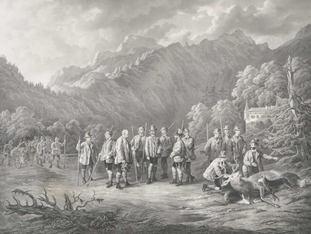 L’ imperatore Francesco Giuseppe I. con gruppo di cacciatori davanti a paesaggio alpino con casolare di caccia a Offensee presso Ebensee