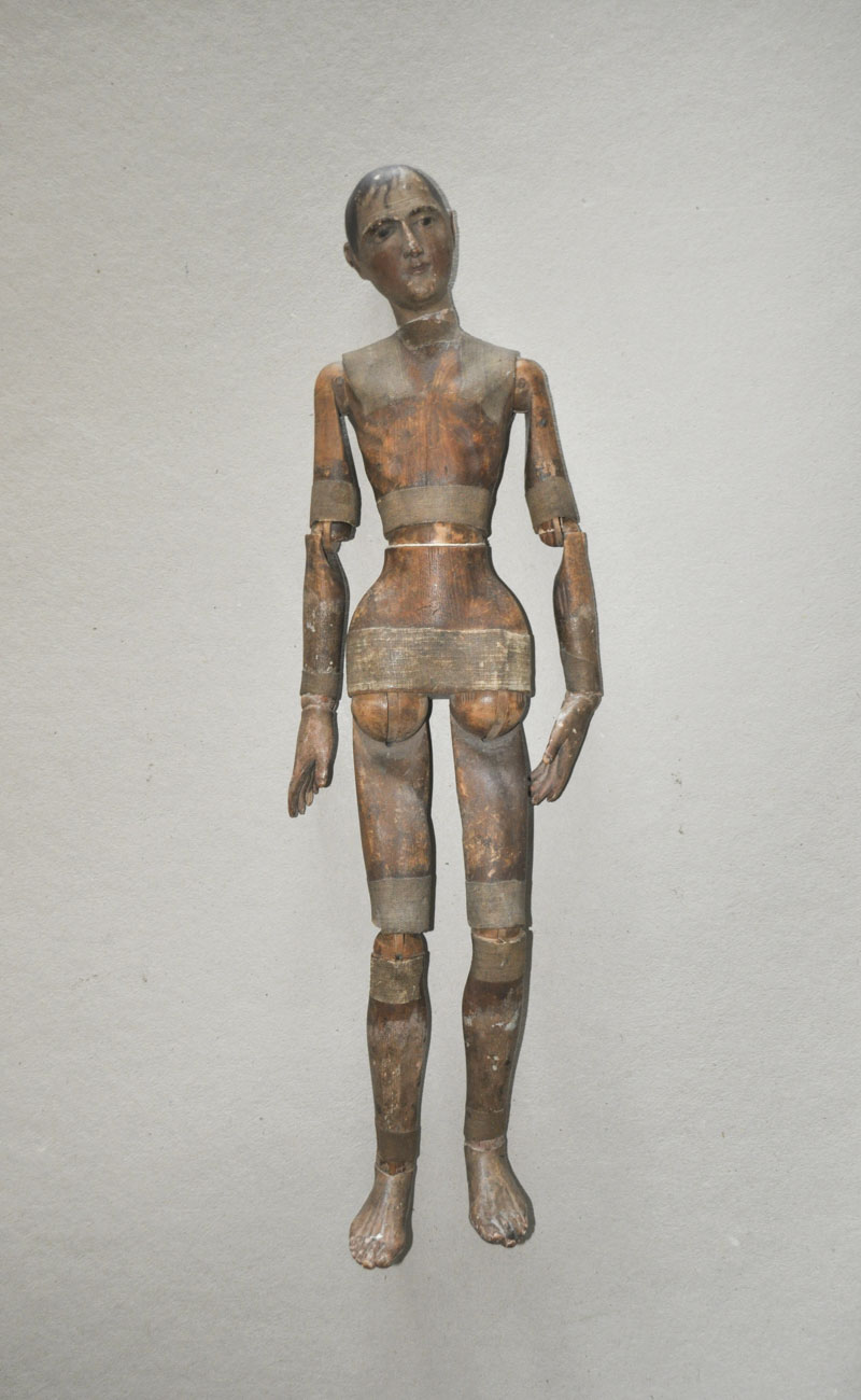 Legno, testa dipinta, tracie di usura, cerniere in