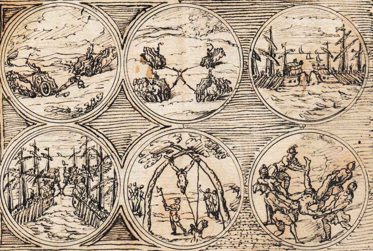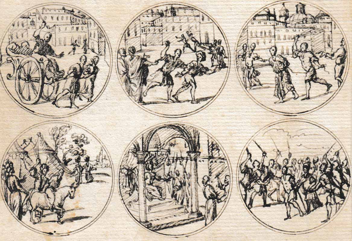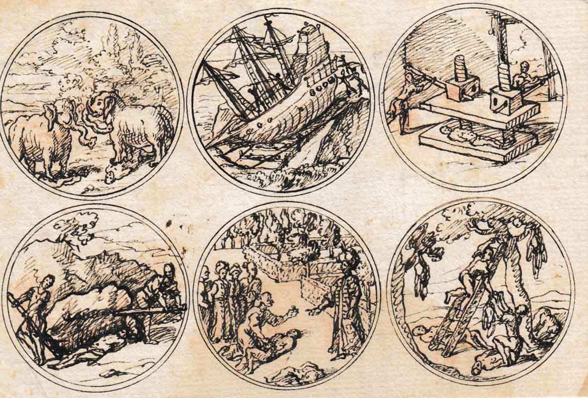 17 fogli, ognuno con 6 rappresentazioni, china, dimensione dei fogli ca. 13,5 x 19,7 cm, danni dovuti alletà. Sul retro in parte altre rappresentazioni, su un foglio testo italiano che non sembra riferirsi direttamente ai disegni: Silvestro Mondin/ro (?) Piemontese d`Anni 16 circa