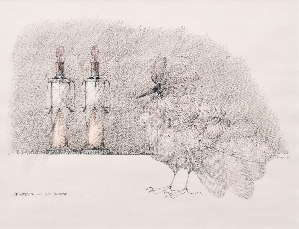 Paul Flora – Un uccello decorativo con due figure, 1973