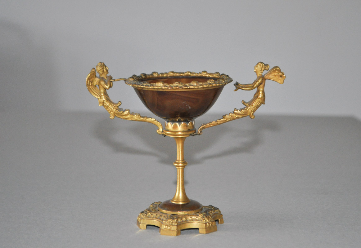 Coppa in agata bruna, bronzo dorato, alt. 12 cm ca.