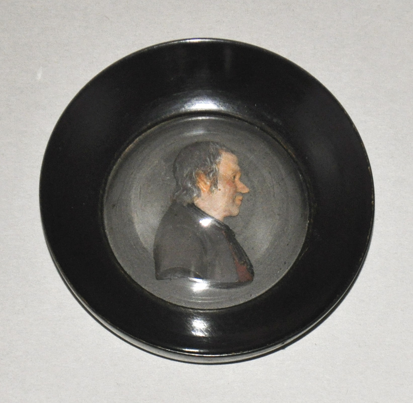 Miniatura in gesso, colorata, d 6 cm, in cornice