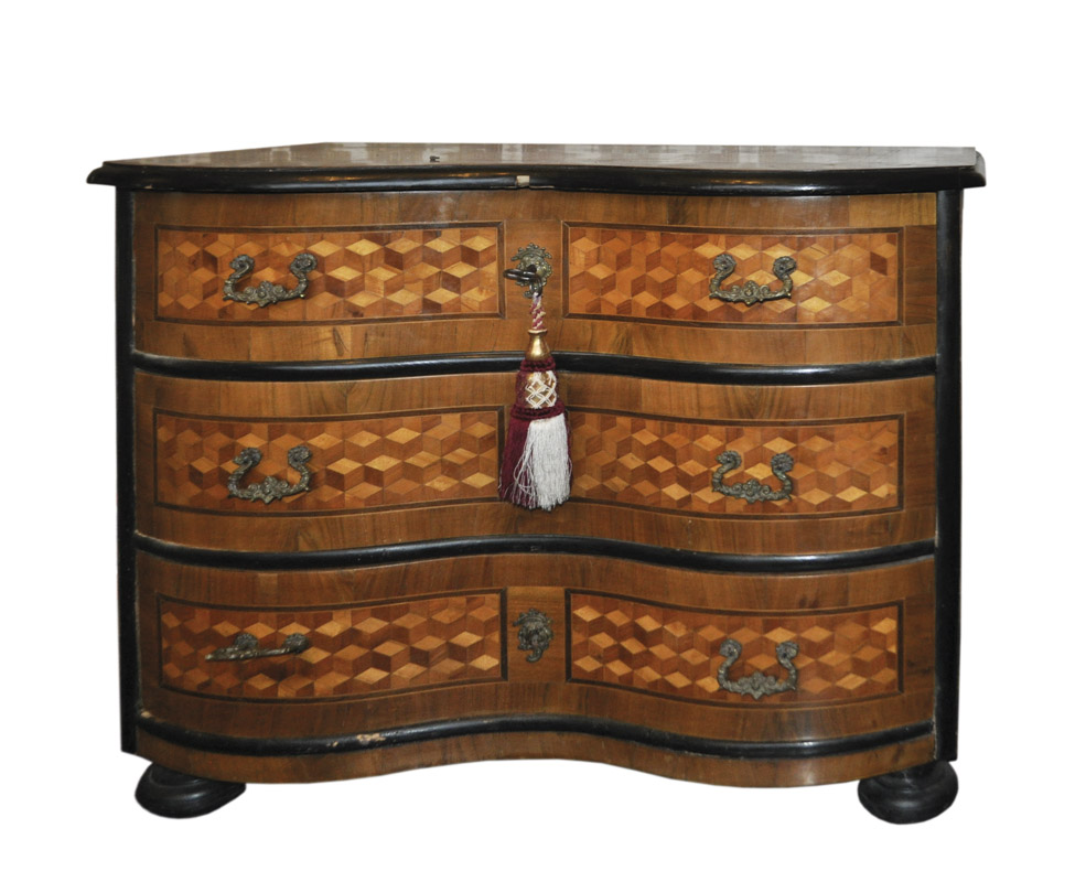 Legno intarsiato, disegno a quadretti, 86 x 97 x 60 cm, danni