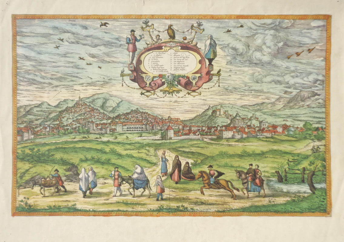 Incisione in rame col. coeva, 32,3 x 50 cm, foglio 40,7 x 55,8 cm, tratto dallsopera Civitates Orbis Terrarum, Liber Primus, Colonia, Gottfried von Kempen, lievi strappetti ai margini per il resto buon esemplare