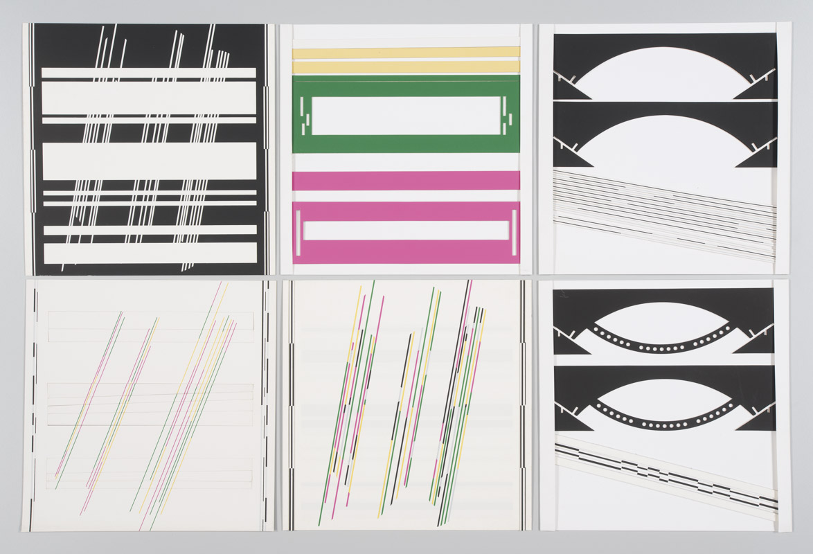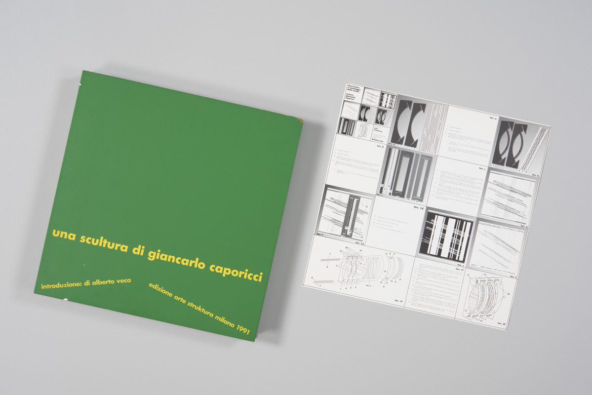 Cofanetto in legno laccato verde, 33 x 33 cm. Contiene 3 tavole serigrafiche + 3 tavole serigrafiche fustellate di elementi per la composizione e il montaggio della scultura e della tavola a rilievo composta da elementi modulari: 4 supporti, 20 segmenti colorati di diverse dimensioni e diverso colore, 2 listelli bianchi, 2 reticolati tensitivi uno
