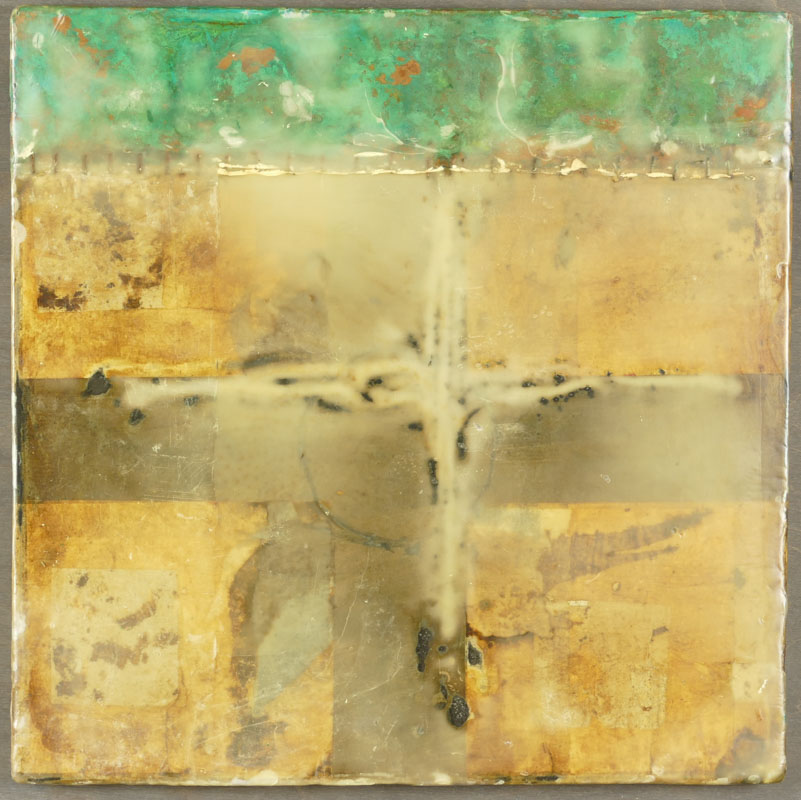 Pigmenti resinosi e cera su lastra in rame su legno, 41 x 41 cm, in cornice.